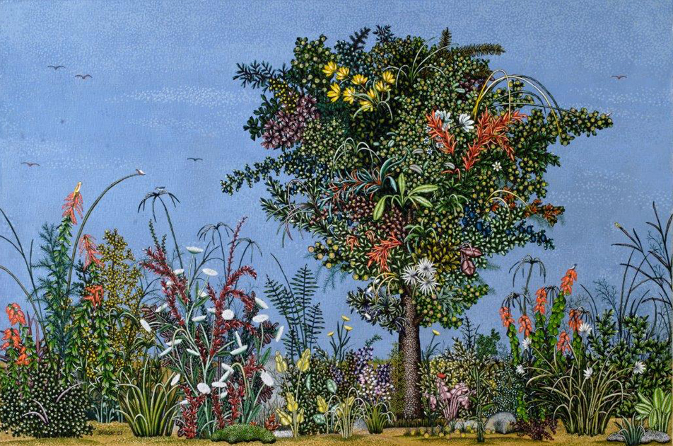 zu einem geradezu kostbar wirkenden Bildgewebe nebeneinander und modelliert so Flächen zu Flächigem. Dicht umstanden wird alles von kraftvoller Vegetation, minutiös und altmeisterlich gemalt.