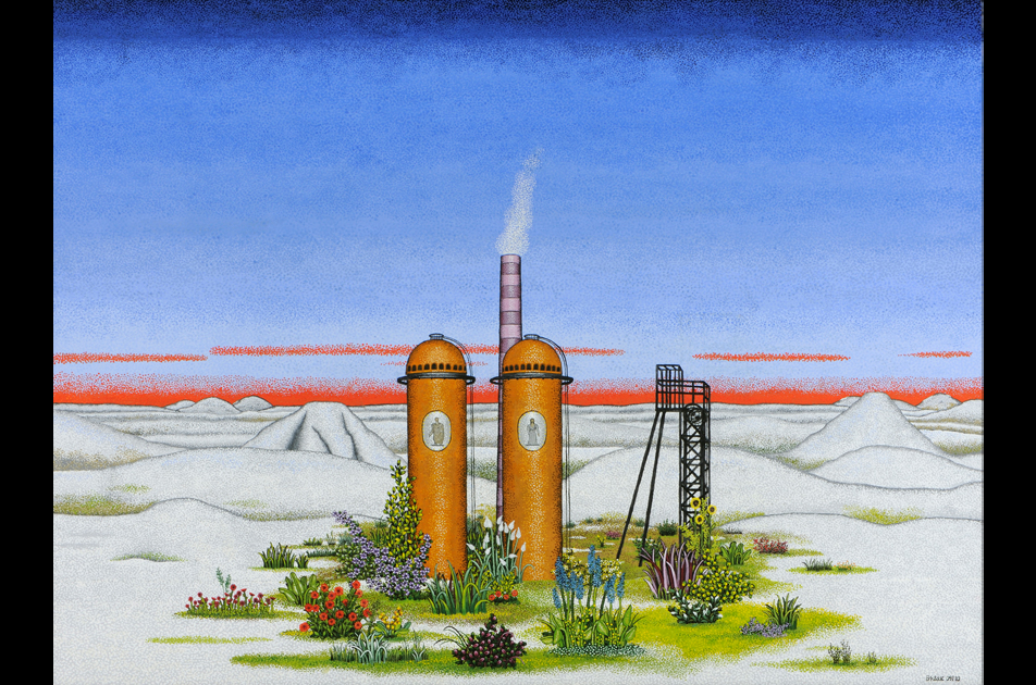 Of particular note is her painstaking technique. Using small points, almost like the punches of a goldsmith, she places the tempera colours alongside each other upon a seemingly almost sumptuous canvas, thus turning textures into two-dimensional images. Everything is closely surrounded with powerful vegetation, painted meticulously and in the style of an old master.